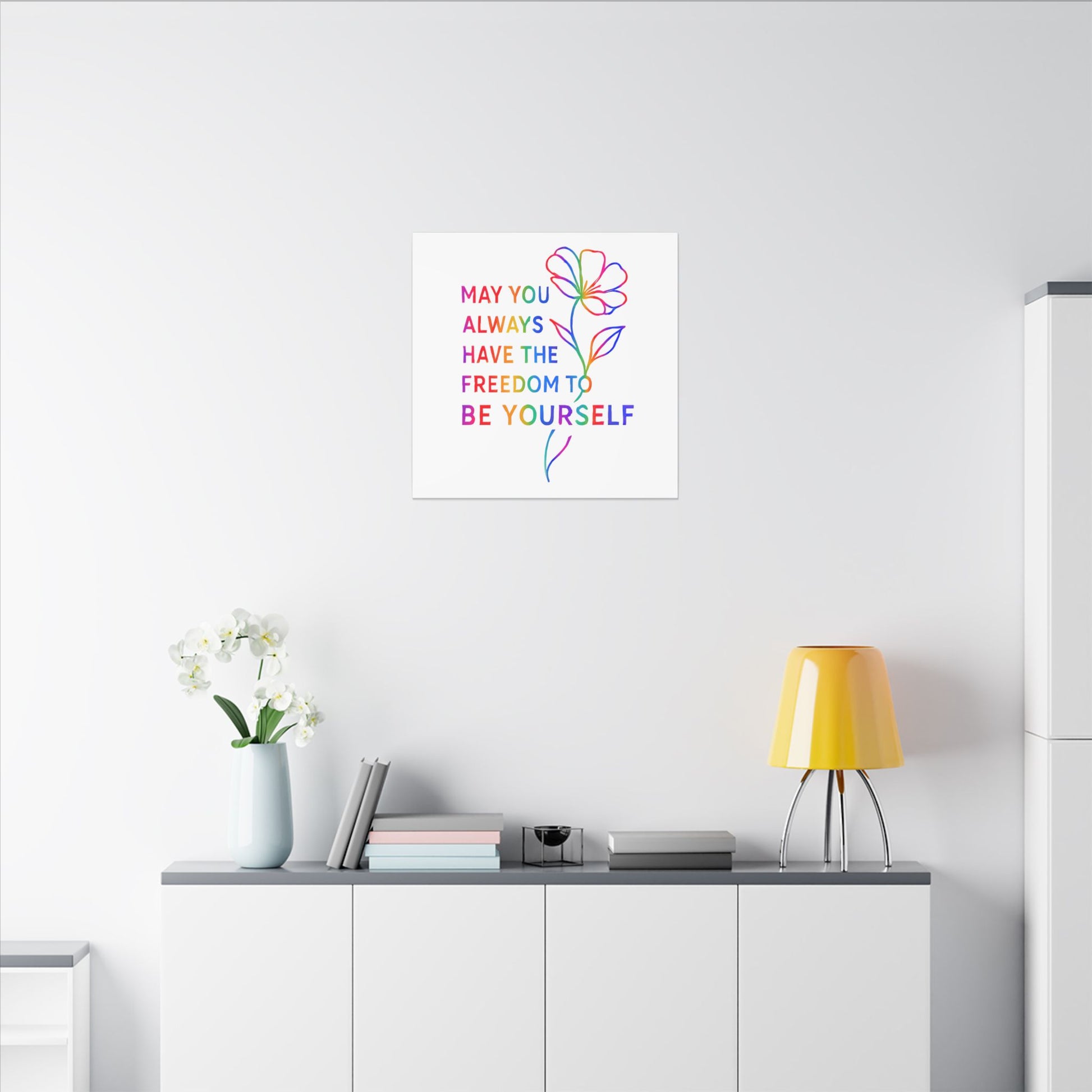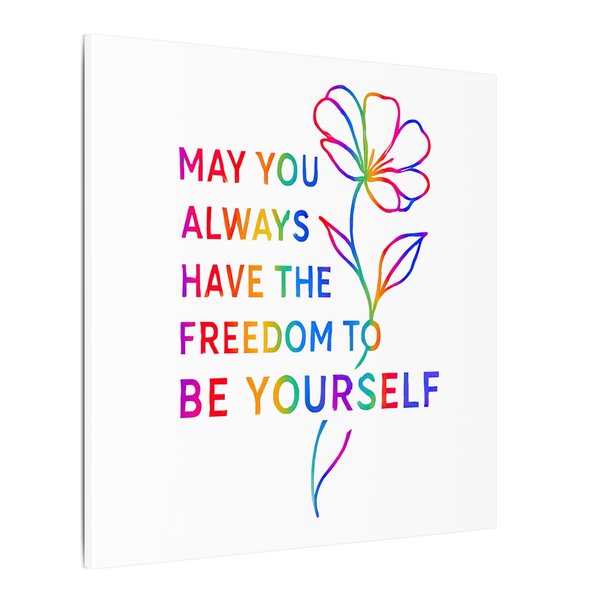 This rainbow affirmation print, featuring the words “May you always have the freedom to be yourself” alongside a flowing hand-drawn floral illustration, brings a heartfelt reminder to any space.