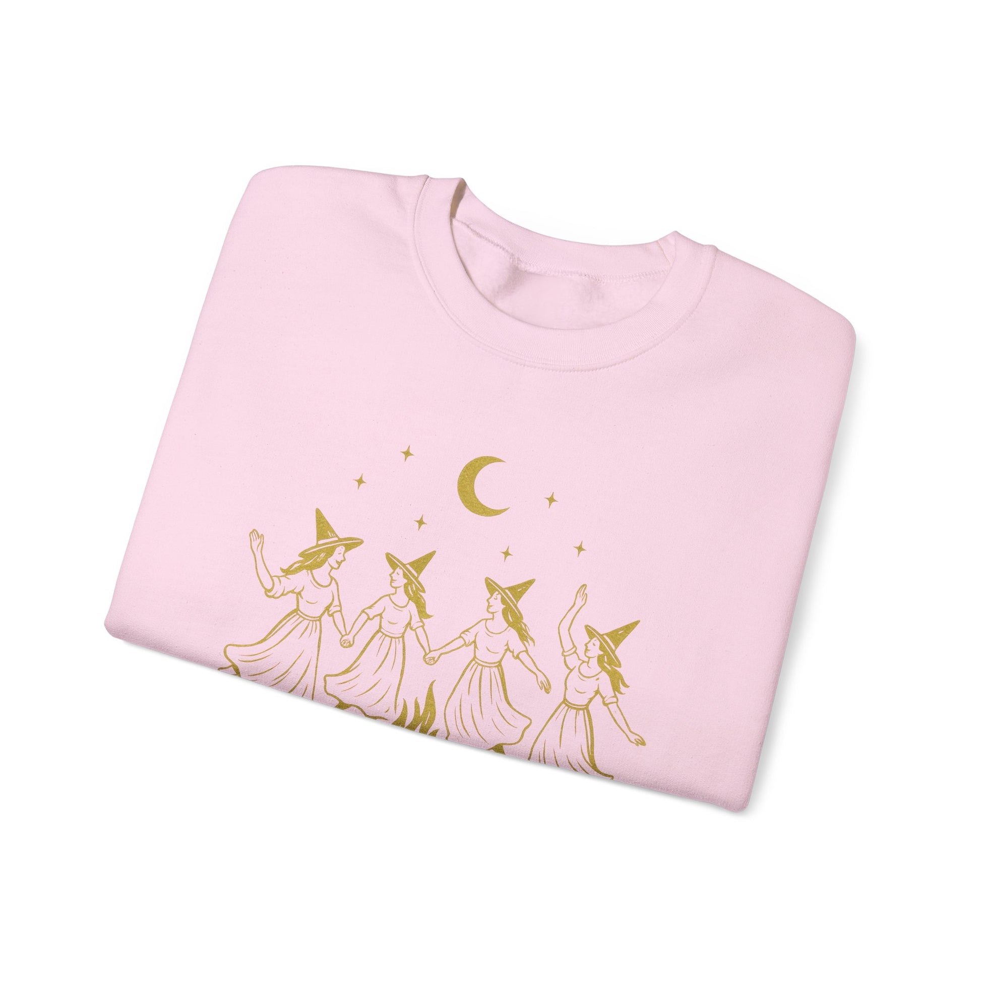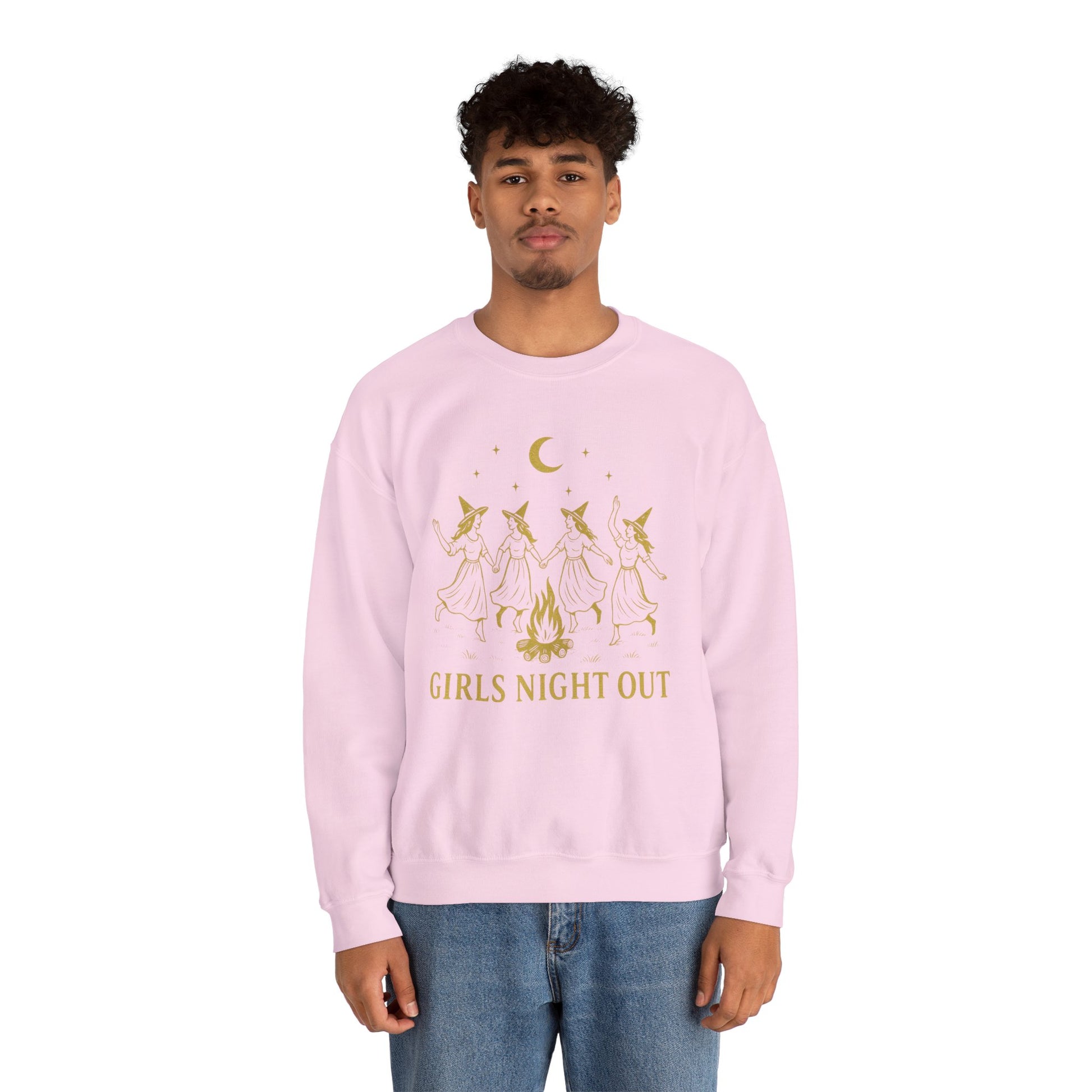 Celebrate sisterhood, magic, and a little mischief with this Girls Night Out crewneck sweatshirt. Featuring a golden graphic of four dancing witches circling a glowing bonfire under the moon and stars, it brings charming witchy energy to your everyday wardrobe.