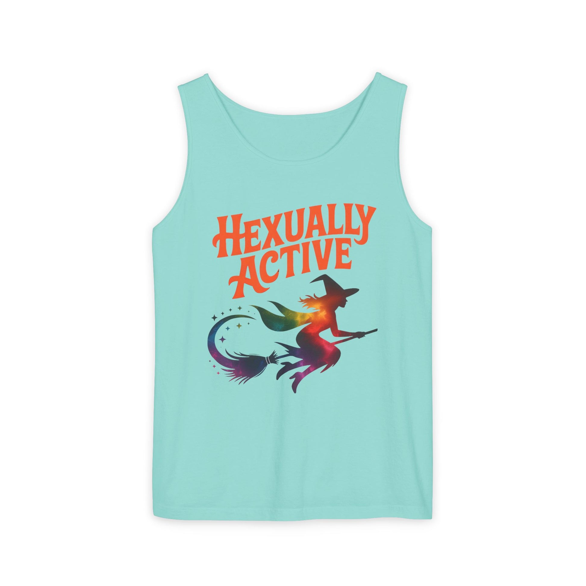 Flirt with fate and stir up some trouble in this Hexually Active Comfort Colors® tank, the sassiest spell in your closet. With a fiery rainbow witch blazing across the front and bold retro lettering, this top brings chaotic good energy wherever you go. Equal parts playful and powerful, it’s made for witches who mix spells with spice and keep their cauldrons hot and unbothered. Serve lewks and laughter all summer in this unapologetically bold piece of wicked witch fashion.