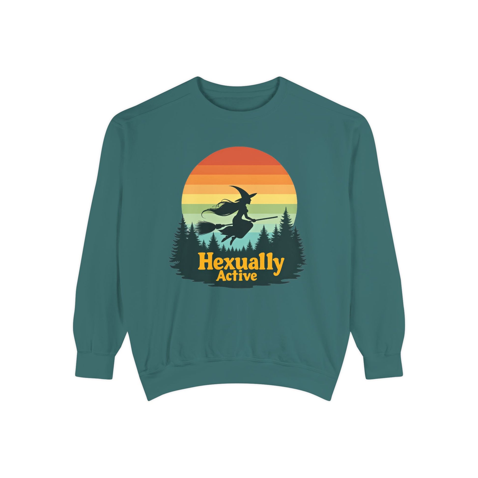 Time to get cozy while causing chaos! The Hexually Active Crewneck is for the witch who is both magically potent and loves to be comfortable. This design is dripping with sassy humor, featuring a classic silhouette of a spellcaster soaring over a pine forest against a striking, retro sunset background. It’s an irreverent, bold, and funny take on magical energy, perfect for layering during chilly spell-casting sessions or casual coffee dates. Wear it when you're casting spells, enjoying a coven meeting, or just reminding the world that you're activated and ready for action. Because your magic isn't the only thing that's potent.