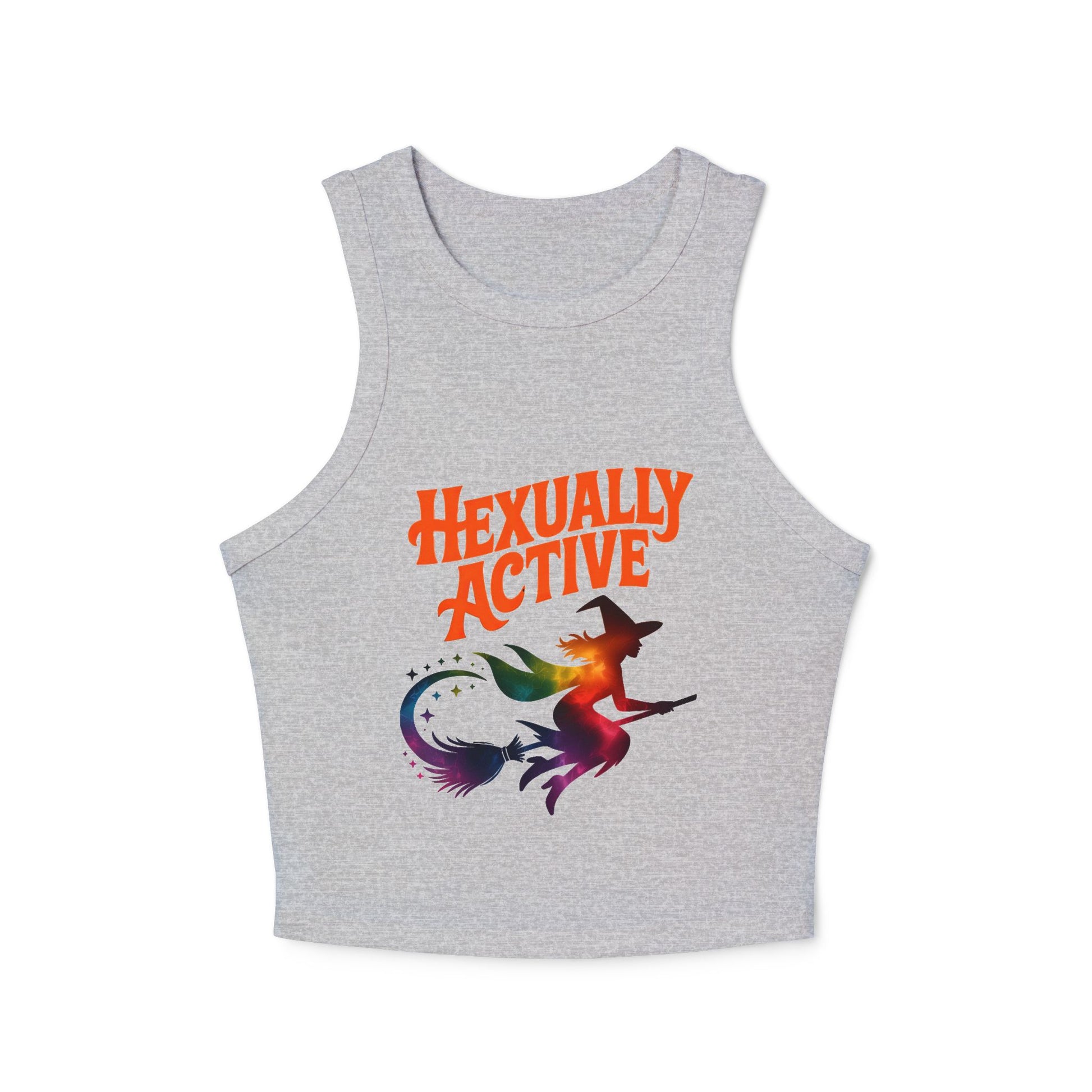 Make a bold entrance with our “Hexually Active” racer tank — a cheeky, confident design for the witch who’s loud, proud, and casting spells with sass. Featuring a rainbow witch flying under a crescent moon trail of stars, this fitted crop tank celebrates magical self-expression with a flirty twist. Whether you're channeling hot girl summer, dancing under the stars, or marching with pride, this top serves glam, humor, and spellbinding style in one magical swoop.