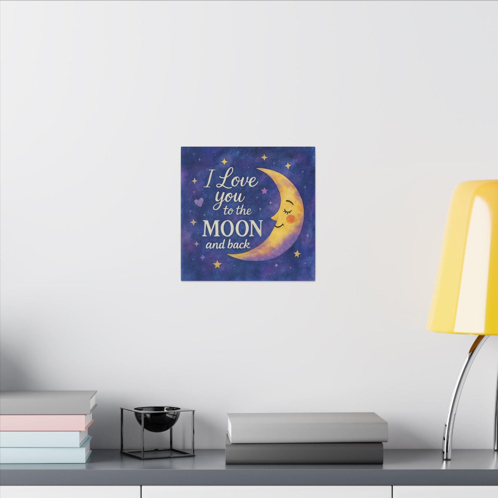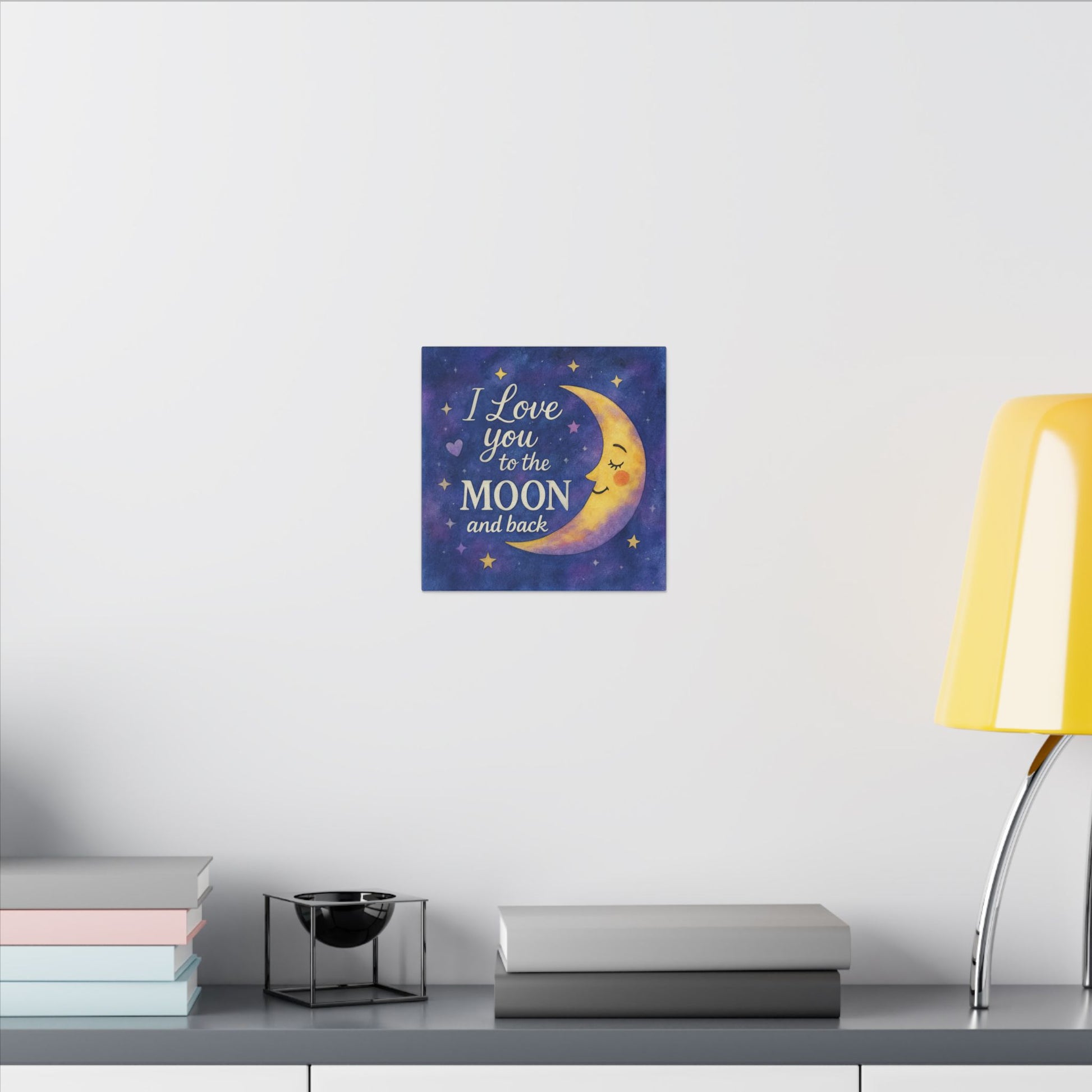 Bring a little magic into your space with this dreamy I Love You to the Moon and Back art print. The deep blue sky, soft watercolor glow, and sweet crescent moon give this piece a comforting, peaceful feel that works beautifully in bedrooms, reading nooks, nurseries, and anywhere you want a touch of heart and warmth.