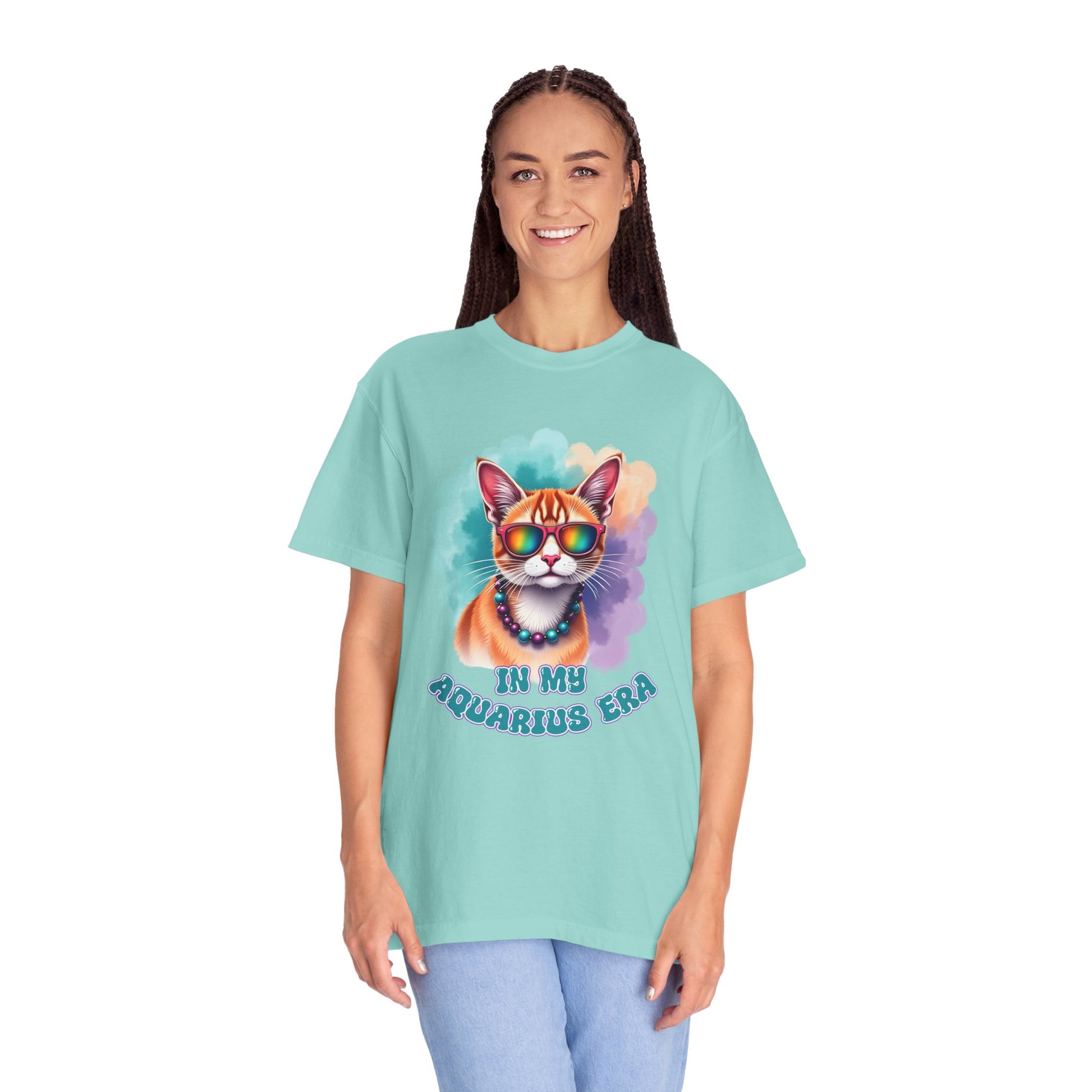 Step into your cosmic coolness with this In My Aquarius Era tee, featuring the ultimate icon of chill: a rainbow-shaded tabby cat rocking retro glasses and gemstone beads. With a splashy pastel aura and unapologetically quirky energy, this Aquarius t-shirt channels pure Aquarian freedom—bold, brilliant, and always ten steps ahead. It’s for the innovators, rebels, and celestial cat whisperers out there living life on their own weird and wonderful terms. 🧿💙🐾