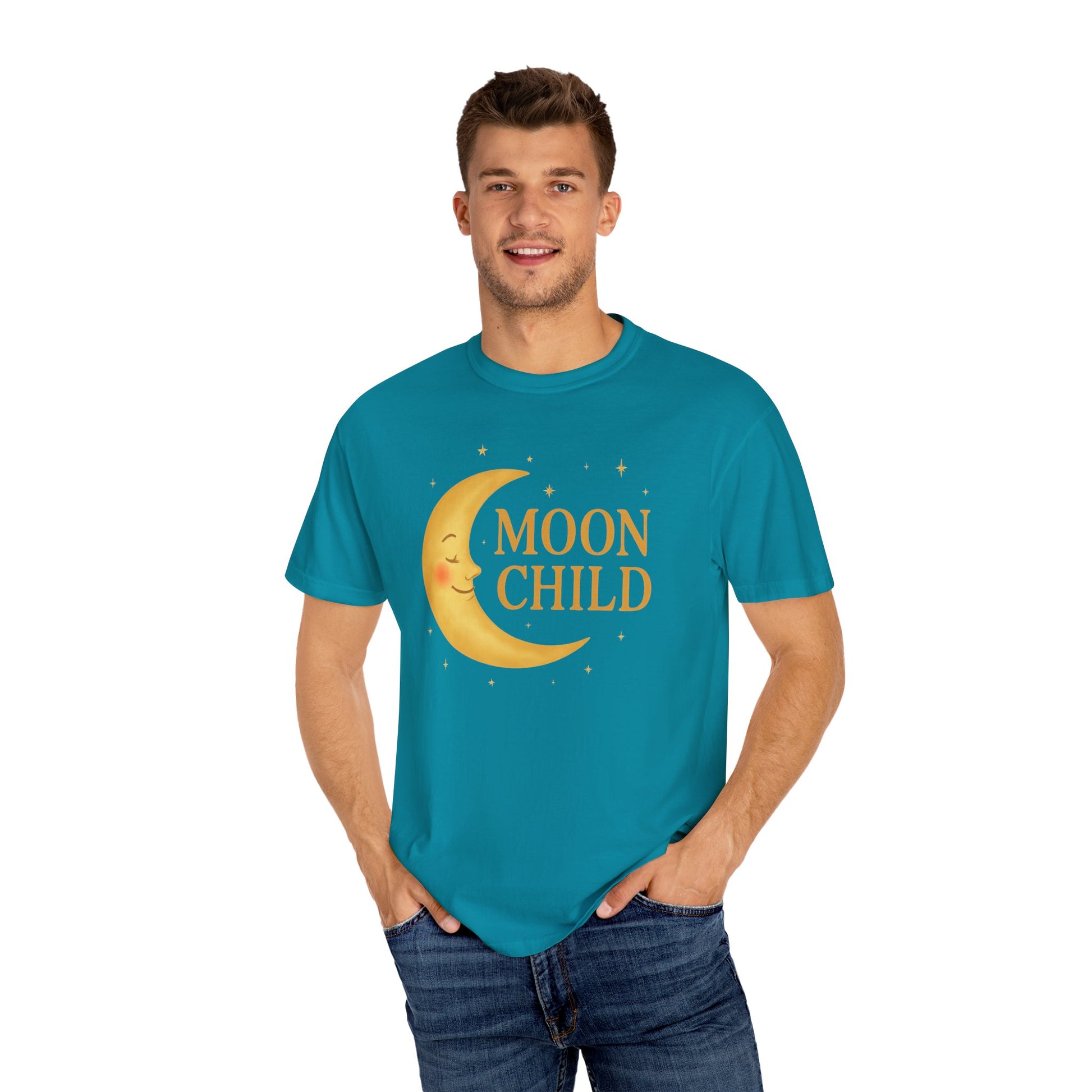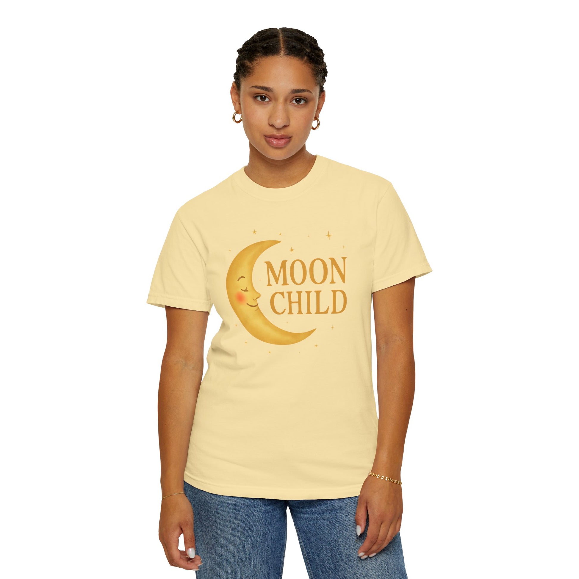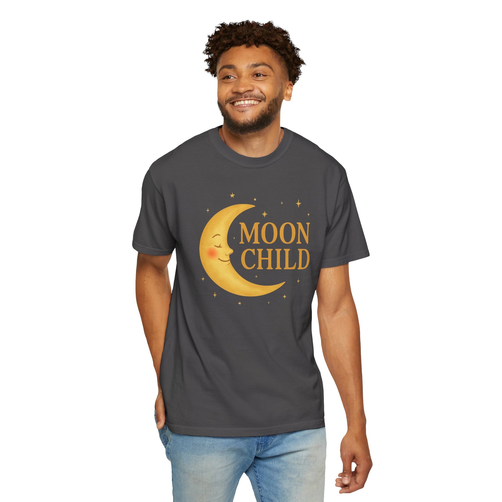 If you feel most at home under a starry sky, this one’s for you. The Moon Child Crescent Tee features a beautifully rendered smiling moon in a vibrant golden hue that truly glows against the fabric. This celestial graphic captures a dreamy, luminous quality, making the color palette feel expressive and magical. This is more than a shirt; it’s a gentle declaration of your cosmic origins and your soft, moon-led spirit. Wear it when you're looking for comfort, reading your horoscope, or simply dreaming under the light of the full moon. You are a true Moon Child, beautifully aligned with the cosmos.