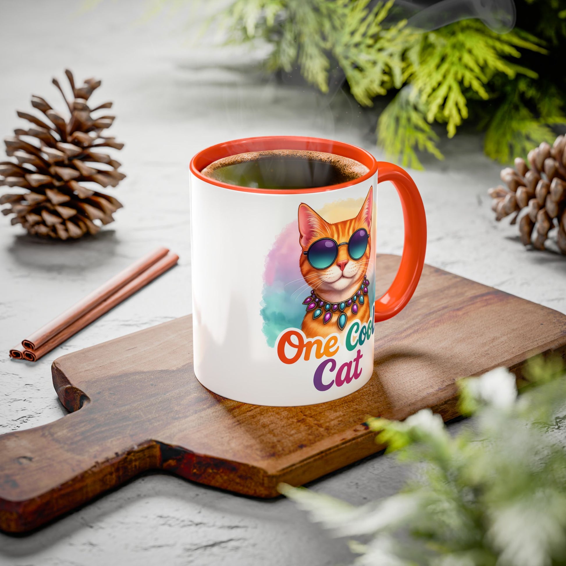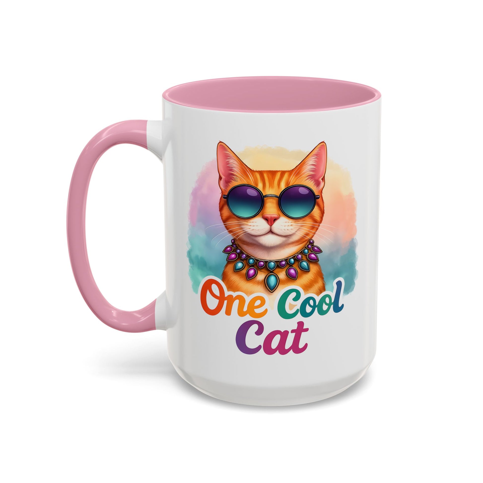 This mug is puurrrfectly cool. The One Cool Cat mug features a stylish sunglasses-wearing kitty against a vibrant watercolor backdrop, bringing instant personality to every sip. With multiple accent colors to choose from, you can pick the version that matches your vibe — bold, bright, or beautifully chill.