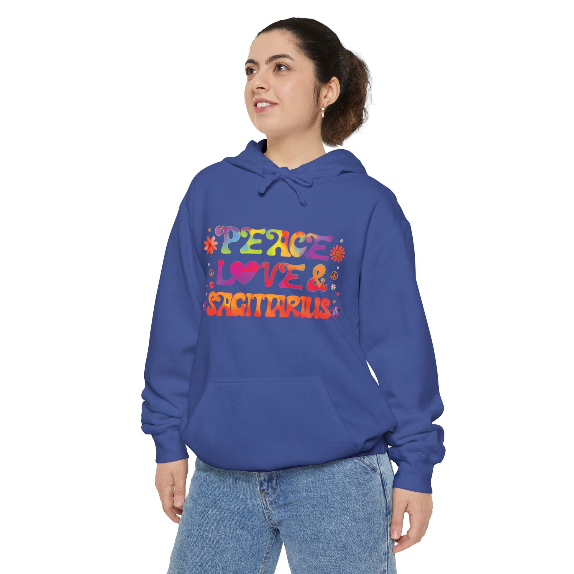 Tune into your cosmic energy, Sagittarius style! This Peace Love & Sagittarius Hoodie features bold, psychedelic lettering and a full explosion of color and groovy flower power accents. It's a nostalgic nod to the 70s and 60s, perfect for the adventurous, optimistic soul who loves astrology and bohemian vibes. This hoodie lets you wear your sign and your good intentions proudly, making a colorful statement everywhere you go.